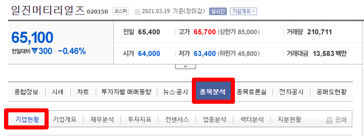 두번째는 제가 블로그 포스팅을 하면서 꼭 소개해드리는 현금흐름표 입니다. 요거는 매우 간단하게 보는 팁을 알려드릴테니 외워두셨다가 볼때마다 대입하시면 됩니다. 자 일단 네이버 기준으로 종목분석탭 - 기업현황탭으로 들어갑니다.