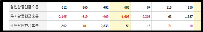 투자활동은 기업을 위한 투자를 계속 하고 있다는 뜻이기 때문에 적자인게 좋습니다. 기업의 발전을 위해 계속 투자를 할 수 있는/하고 있다는 탄탄한 기업이라는게 증명이 되거든요.