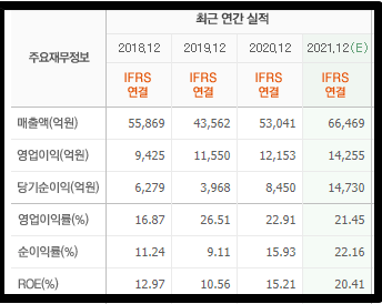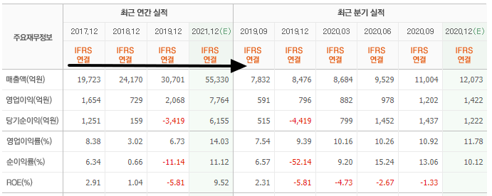 카카오의 재무제표 입니다. 지금 보시면 2017년부터 꾸준히 매출이 증가하고 있는게 보이시죠? 2021년 예상 매출은 무려 5조 5천억원이 예상되고 있습니다. 2017년대비 거의 3배 가까이 뛰는 모습을 보여주네요.