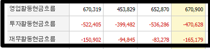 그리고 스크롤을 계속 내리다 보면 이렇게 영업활동,투자활동,재무활동으로 인한 현금흐름표가 나오게 되는데요. 이걸 보는 방법을 간단한 공식으로 알려드리면