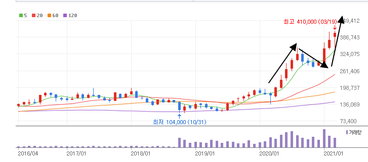 이게 네이버의 재무제표인데 보시면 ROE도 상당히 준수하고, 매출액과 순이익도 계속 늘어나고 있습니다. 그렇기 때문에 주가가 고가권임에도 계속 사려는 사람들이 늘어나서 최고가를 돌파하고 있는 거겠죠.