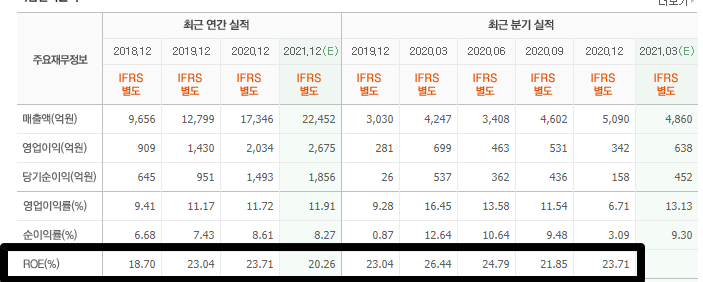오마하의 현인 '워렌버핏' 도 ROE가 꾸준히 잘 나오는 기업을 선택해서 투자하라고 했을 정도로 상당히 중요한 지표입니다. 특히 저는 단기 투자 종목보다 2년 이상 장투를 계획하고 있는 종목을 선택할때 꼭 필요한 지표라고 생각하네요.