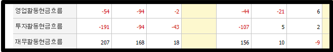 그리고 스크롤을 계속 내리다 보면 이렇게 영업활동,투자활동,재무활동으로 인한 현금흐름표가 나오게 되는데요. 이걸 보는 방법을 간단한 공식으로 알려드리면
