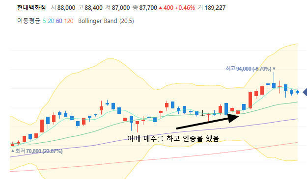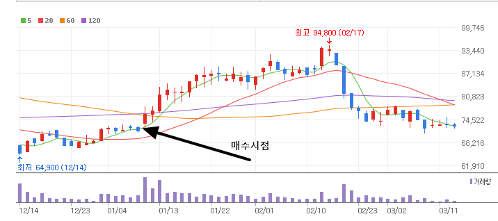 자 제가 이 포스팅을 올렸을 시점이 바로 2월 24일이고 이때 80,700원에 매수를 했습니다. 왜 매수를 했는지는 자세히 제가 설명했기 때문에 포스팅을 읽어보시면 될 것 같습니다.