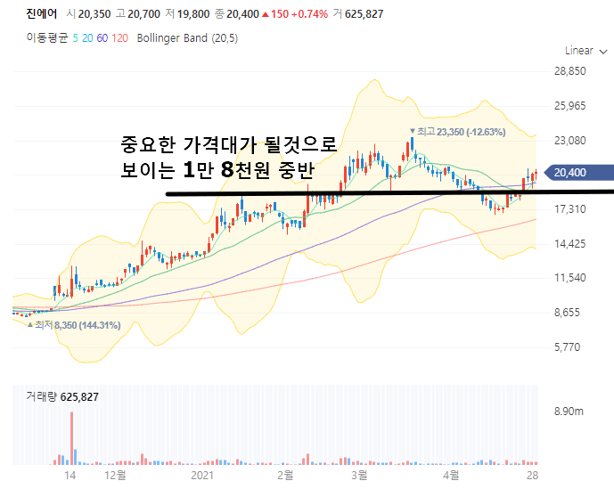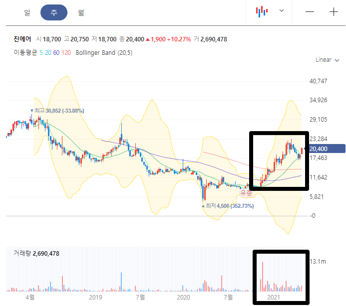실적은 매우 안좋은 상태지만 2021년 초부터 시작해서 무려 4배가 상승한 진에어 입니다. 큰 거래량과 함께 모든 이평선을 뚫고 올라오면서 현재 꽤나 고가권에 위치하고 있습니다.