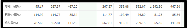 부채와 유보율 역시 매우 불안정한 상황으로 접어들었습니다. 기업운영 자체가 지금 꽤 힘든 상황이죠.