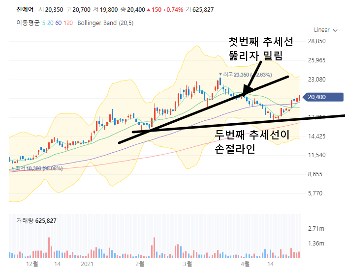 실적은 매우 안좋은 상태지만 2021년 초부터 시작해서 무려 4배가 상승한 진에어 입니다. 큰 거래량과 함께 모든 이평선을 뚫고 올라오면서 현재 꽤나 고가권에 위치하고 있습니다.