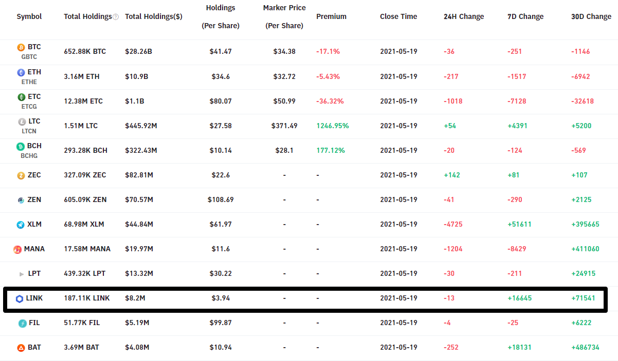 또한 그레이스케일 포트폴리오를 살펴보면 체인링크를 상당히 많이 사들인걸 볼 수 있습니다. 그레이스케일 포트폴리오는 사실 뭐 코인 하시는 분들은 다 아시는 투자그룹이죠. 이 그룹이 사들인 코인들은 대부분 호재로 엮여 올라가곤 합니다.