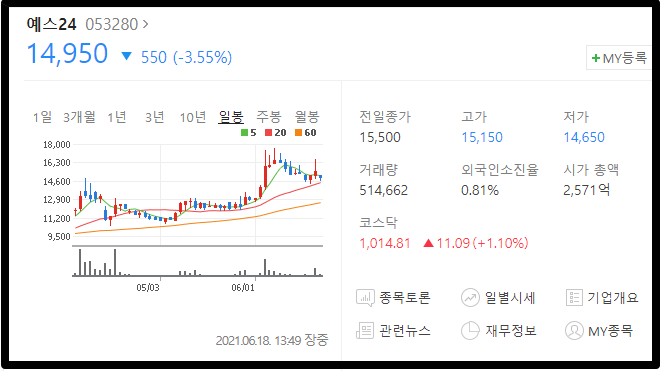 마지막 종목은 예스24 입니다. 카카오뱅크의 지분 1.87%를 보유하고 있지만 모멘텀 관련해서는 시세를 상당히 쎄게 주고 있는 종목입니다. 아무래도 시총이 다른 종목에 비해 작아서 그런 것 같네요. 예스 24도 14000원대 초반에 오면 한번 담아볼만은 할 것 같습니다.