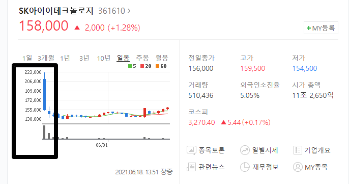 카카오뱅크 공모주를 노리는건 좋은데 괜히 상장 당일날 풀배팅 하지 마세요. 이렇게 SKIET 의 사례가 있기 때문에.. 항상 조심하고 또 조심해야 합니다.
