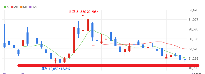 2020년 12월 9일에 상장된 종목이며 사실상 따끈따끈한 신주급 이라고 보면 되겠습니다. 차트를 보시게 되면 이제 최저점까지 거의 내려왔습니다. 여기서 더 깨고 내려갈 수도 있습니다. 그것까지 충분히 생각하고 있으며 예상 대응 방안까지 준비중입니다.