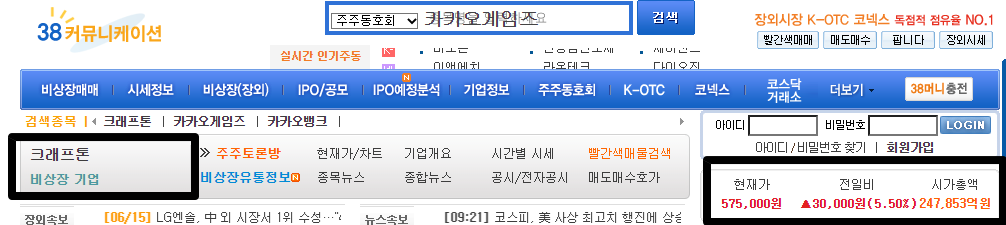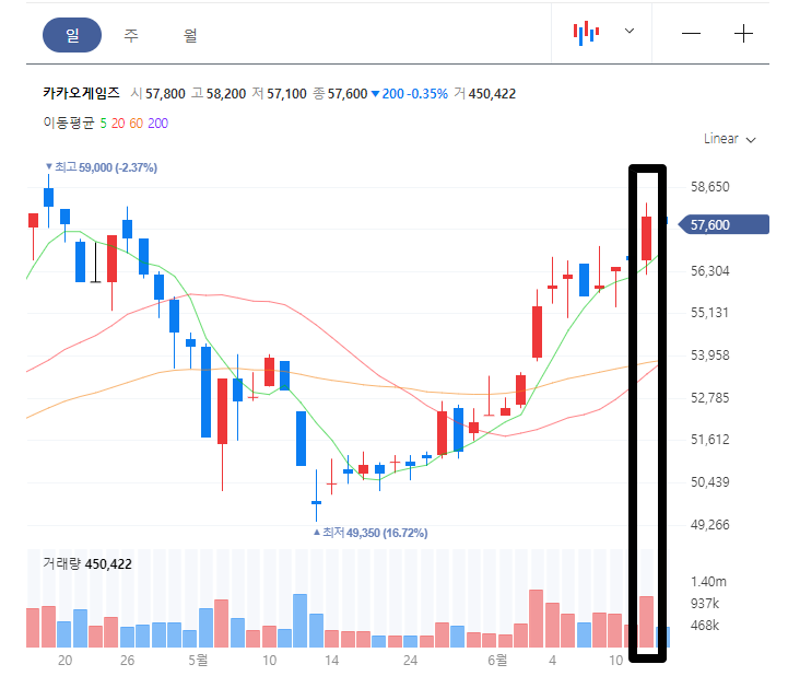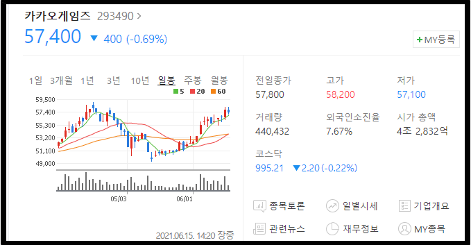 6/11일에 크래프톤의 상장예비심사 승인이 되었었는데 이때 카카오게임즈를 뺀 나머지 종목은 시세가 좋지 않았습니다. 카카오게임즈만 그 다음날 카카오 주가 폭등 + 크래프톤 모멘텀으로 인해 상승을 했었죠.