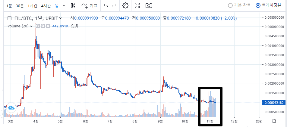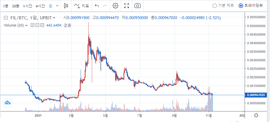 또한 저는 업비트의 파일코인 사토시 차트에서 매우 수상한 거래량이 터졌기 때문에 이것이 세력의 매집이라고 보고 있습니다. 파일코인은 이미 매우 바닥권인데다가, 2021년 통틀어서 가장 큰 거래량이 최근에 몰아서 터지고 있기 때문에.. 이건 충분히 상승을 위한 첫번째 신호탄이라고 봐도 될 것 같네요.