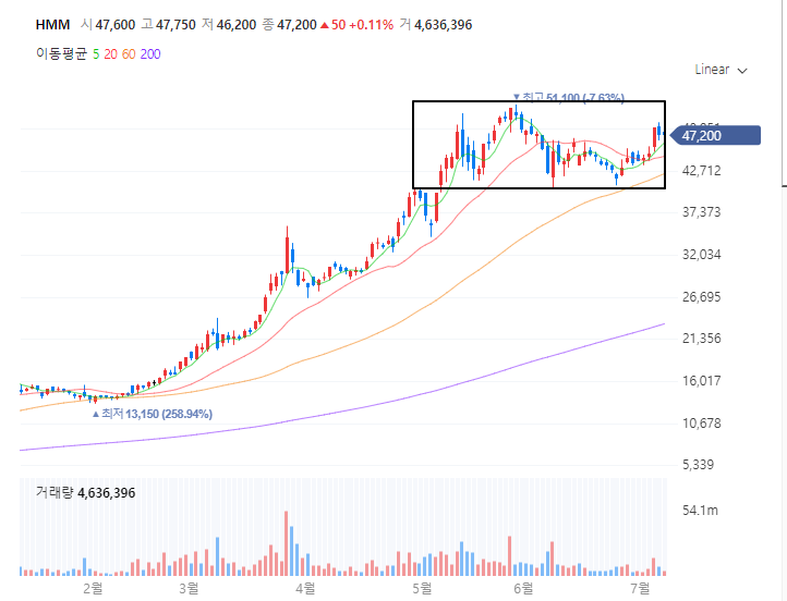최근에 해운주의 1대장인 HMM의 움직임이 박스권 횡보를 유지해주고 있습니다. 다만 최근에 올라온거에 비하면 저정도 횡보는 사실상 고가수렴이라고 볼 수 있는데요.