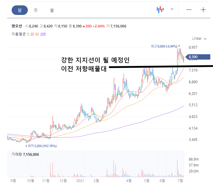 팬오션의 차트는 현재 상승추세에 놓여있습니다. 7,600 원 대에 있는 저항매물대를 강하게 돌파했기 때문에 만약 매수를 받을 분들은 저 곳이 깨지면 손절할 각오를 해야 합니다. 다른 말로 하면 저기는 충분히 매수를 받아도 되는 자리겠죠.