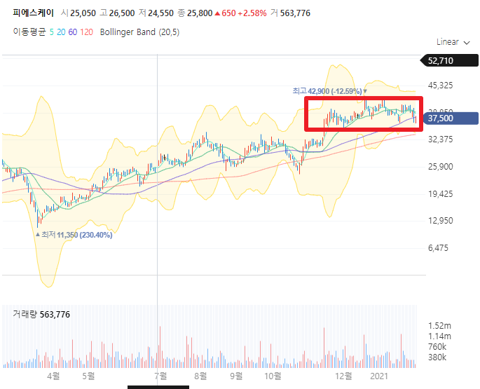 피에스케이는 증시가 매우 뜨겁던 12월과 1월에는 오히려 재미를 못봤던 종목입니다. 반도체 관련주 들이 엄청난 펌핑을 받을때 정작 박스권에서 횡보를 하고 있던 중이었죠.