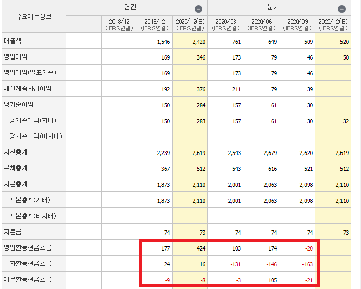 현금 흐름 역시 무난한 흐름인데요. 영업활동으로 꽤 많은 수익을 창출했고 자금 역시 많이 빌린 상황은 아닙니다. 그리고 아직까지 적극적인 투자는 하고 있지 않기 때문에 투자활동현금흐름은 흑자인 상태입니다. 아직까지 투자금이 많이 남아있다고 보여지기에 2021년에 반도체 시장이 더욱 좋아지면 공격적인 투자로 이익을 극대화 시킬 수 있어보입니다.