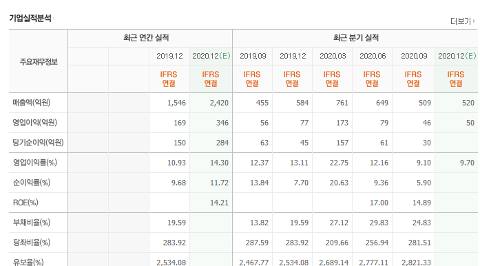 2019년에 인적분할되어 천 억원대의 매출을 기록한 후 이미 1년만에 2천 4백억으로 증가했습니다. 상당히 폭발적으로 증가했으며 더욱 증가할 예정이죠. 부채비율과 유보율 역시 매우 안정적인 모습을 보여줍니다. ROE도 상당히 맘에 드네요.