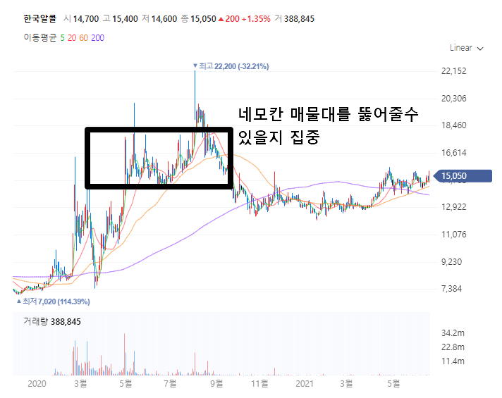 한국알콜 차트는 크게 분석할게 없고 저기 상당한 매물이 모여있는 매물대를 뚫어줄 수 있을지에 대해 봐야합니다. 2020년 9월에 꽤 큰 하락이 있고 나서 더 떨어지지 않고 거래량없이 횡보 + 강보합 모양세를 보여주고 있는데 개인적으로는 저 매물대를 뚫어주면서 상승이 다시 한번 나와줄거라고 생각합니다.