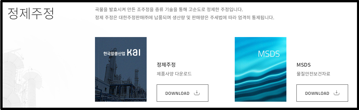 곡물을 발효시켜 만든 조주정이 한국알콜의 가장 주매출원이며, 이 기술은 한국알콜이 가장 독보적으로 가지고 있는 기술이라고 보면 됩니다. 사실상 대한민국의 술은 한국알콜이 없다면 만들어 지지 못하죠.