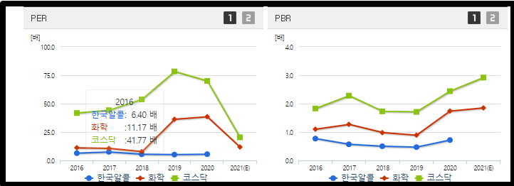 하지만 한국알콜이 또 매력적인 이유는 바로 여기 있습니다. 보시면 PER과 PBR 수치가 이를 말해주고 있는데요. 그 저평가되어있는 화학, 건설 섹터보다도 저평가되어있습니다. PER이 무려 6이고 PBR은 평가불가 수치가 나옵니다. 돈은 매우 잘버는데 사람들의 관심이 없을때 보통 이런 수치가 나오죠.