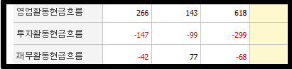 투자활동도 꾸준히 하고 있으며 재무활동도 안정적입니다. 영업활동으로 버는 돈도 상당히 늘어난 상황입니다. 대형주의 현금흐름을 그대로 따라가고 있네요.