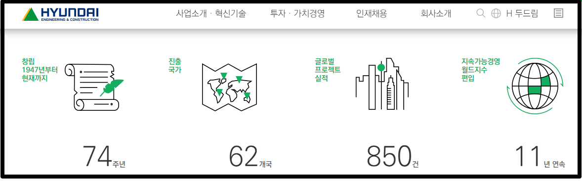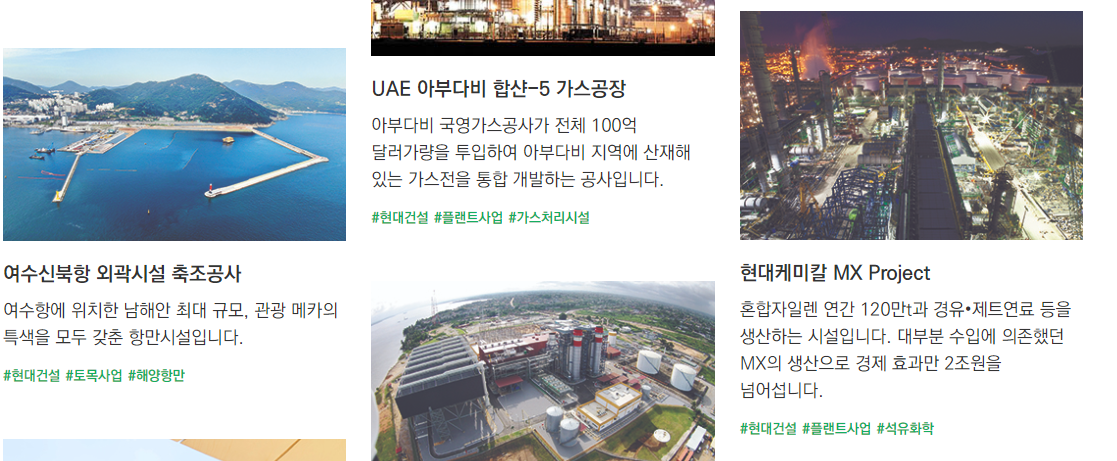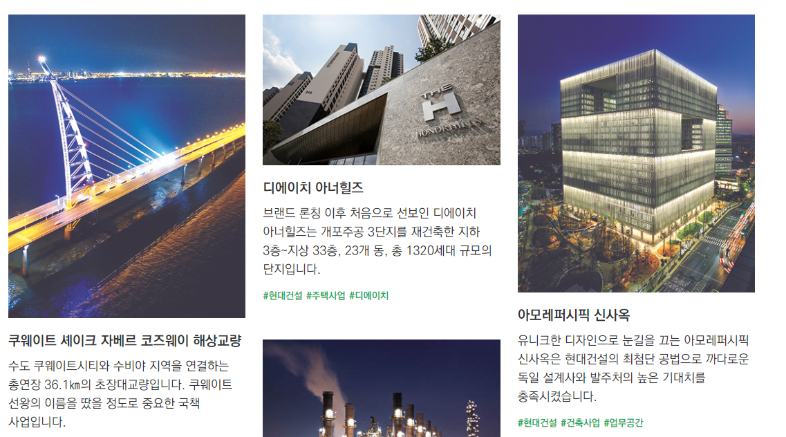 이 밖에도 디에이치, 아모레퍼시픽 신사옥, 힐스테이트, 쿠웨이트 해상교량 등 매우 다양하고 넓은 분야의 건축산업을 도맡아 영위하고 있습니다. 뭐 워낙 국내/해외 가릴것없이 탄탄한 입지를 가지고 있는 기업입니다.