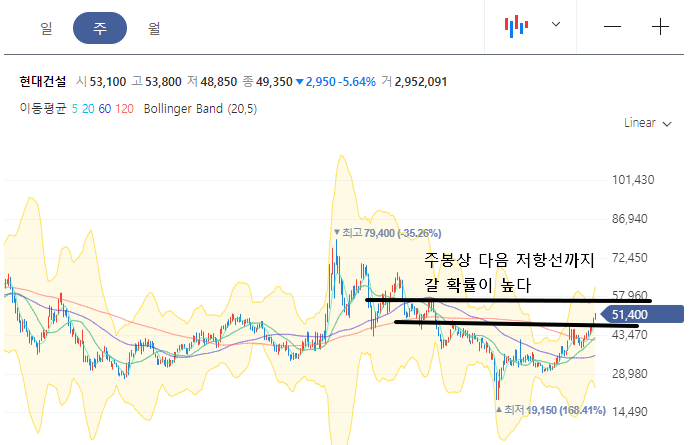 건설주들은 일봉은 의미가 없습니다. 최근에 계속해서 오르고 있기 때문에 매우 고가권 처럼 보여지기 때문이죠. 하지만 주봉 / 월봉을 보게 되면 아직 덜 올라왔다는게 느껴집니다. 현제 현대건설은 다음 저항선 라인인 5만 6-7천원대를 돌파하려고 하는데요. 올해 안에 충분히 넘을 수 있을거라고 생각하네요.