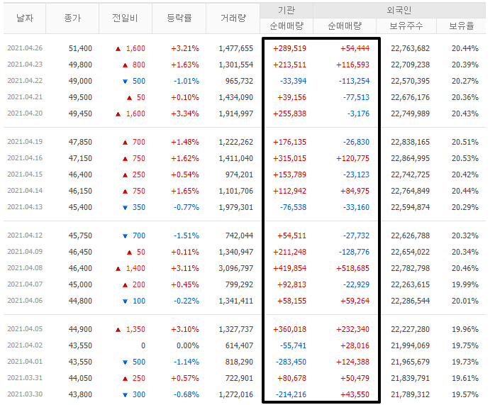 수급도 보시면 매우 좋습니다. 외국인과 기관의 수급이 꾸준하게 들어오고 있죠? 보통 이런 종목들을 유심히 봐야합니다. 기관 외국인이 절대 단기간에 팔고 나가지 않고 계속 모아가거든요.