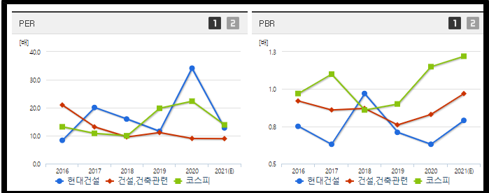 PER이나 PBR은 대체적으로 낮은 수치 입니다. PER은 2020년에 많이 올라왔고 PBR은 아직도 1을 못넘기고 있습니다. 근데 대부분의 건설/건축관련 종목들의 PER/PBR 수치는 낮기 때문에 섹터 비교는 의미가 없죠.