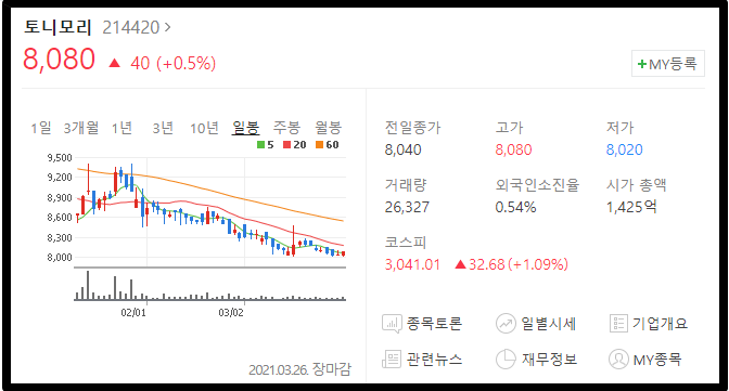 이것도 파멸적인 하락의 길을 걷고 있는 종목인데요 일단 재무제표가 너무 안좋긴 합니다. 일단 그전에도 안좋았는데 심지어 코로나 + 한한령 선포 빔을 맞고 4만 5천원이던 주가가 무려 8천원이 되버렸습니다.. 다만 토니모리는 한한령 해제 이슈가 나오면 조금씩 반등을 주는 종목이기 때문에 단기적으로 접근해서 반등을 줄때 팔아버리는 식으로 매매 하면 좋을듯 합니다.