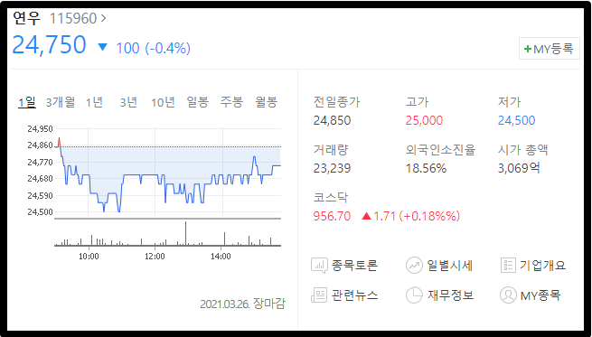 저는 솔직히 연우도 꽤 좋을 거라고 보는데요. 아모레퍼시픽과 LG생활건강이라는 강력한 기업에게 납품을 꾸준히 하고 있기 때문에 한한령 해제로 인한 수혜를 덩달아 무조건 받을거라고 봅니다. 게다가 그래프도 거의 바닥권이라고 볼 수 있구요. 일단 그래프 상으로는 3만원대를 충분히 갈 수 있을거라고 봅니다.