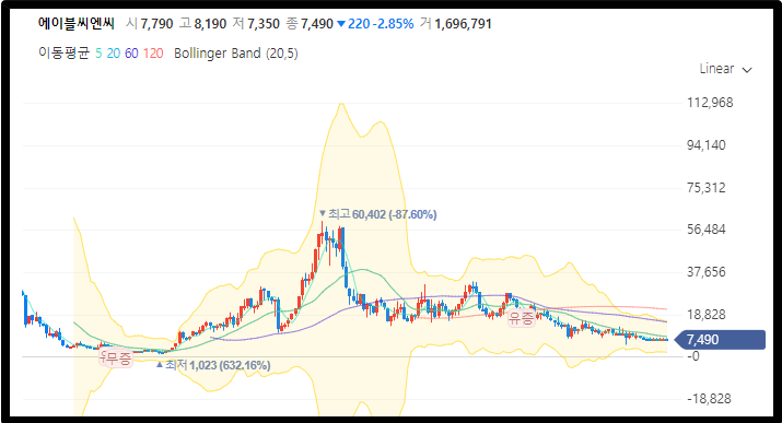 근데 이 종목의 월봉이 상당히 무서운 상황입니다. 위에서 보셨던 화장품 관련주들은 다시 회복하는 캔들이 나와 주고 있는데 에이블씨엔씨는 그런 기미가 아예 보이지 않습니다.. 그냥 묵묵히 내리막길을 가고 있네요. 이런 종목은 반등이 다시 나와주려면 강력한 모멘텀이 나와줘야 하는데 ( 한한령 해제 ) 솔직히 그런 모멘텀을 생각하면 그냥 저 위 대장주 4종목을 매수할 것 같습니다.