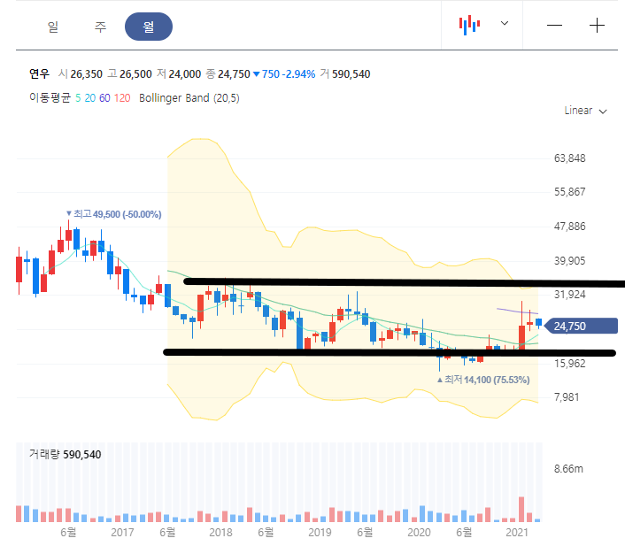 저는 솔직히 연우도 꽤 좋을 거라고 보는데요. 아모레퍼시픽과 LG생활건강이라는 강력한 기업에게 납품을 꾸준히 하고 있기 때문에 한한령 해제로 인한 수혜를 덩달아 무조건 받을거라고 봅니다. 게다가 그래프도 거의 바닥권이라고 볼 수 있구요. 일단 그래프 상으로는 3만원대를 충분히 갈 수 있을거라고 봅니다.