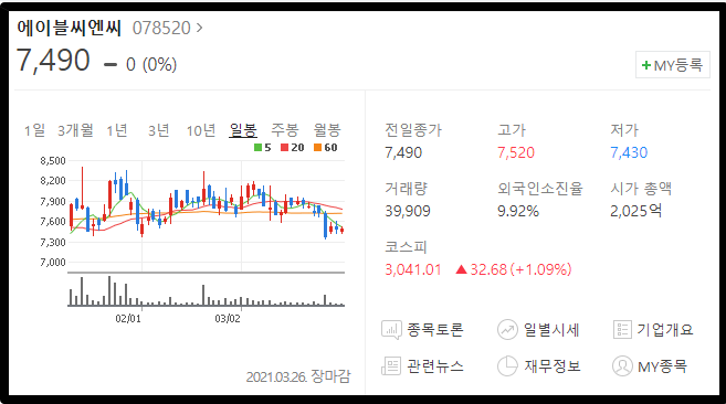 근데 이 종목의 월봉이 상당히 무서운 상황입니다. 위에서 보셨던 화장품 관련주들은 다시 회복하는 캔들이 나와 주고 있는데 에이블씨엔씨는 그런 기미가 아예 보이지 않습니다.. 그냥 묵묵히 내리막길을 가고 있네요. 이런 종목은 반등이 다시 나와주려면 강력한 모멘텀이 나와줘야 하는데 ( 한한령 해제 ) 솔직히 그런 모멘텀을 생각하면 그냥 저 위 대장주 4종목을 매수할 것 같습니다.
