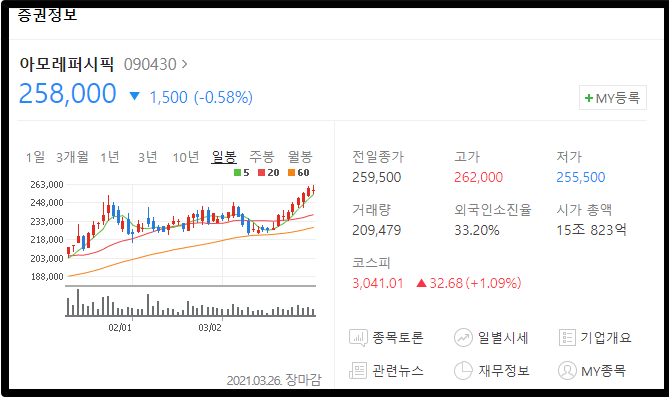 첫번째 종목은 아모레퍼시픽 입니다. 뭐 명실상부한 화장품 관련주 1대장주 라고 해도 과언이 아니죠. 아마 화장품 관련 주식! 하면 가장 먼처 나오는게 이 아모레퍼시픽일 거라고 생각합니다. 화장품 시장의 점유율을 20%나 차지하고 있는 기업이죠