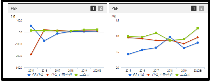 저는 경기민감주, 가치주 종목을 볼때 요 동일섹터 PER/PBR 비교 그래프를 자주 보곤 하는데요. GS건설의 PBR이 코스피와 건설 섹터와 비교했을때 나름 저평가 되어있다는 걸 볼 수 있습니다. PER은 그냥 딱 평균치를 나타내고 있네요.