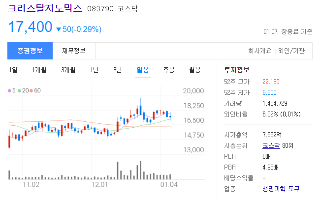 첫번째 기업은 크리스탈지노믹스입니다. JP모건 헬스케어 컨퍼런스 기대감으로 조금씩 상승추세인 종목입니다. 항암 및 항섬유증 치료 신약 후보인 '아이발티노스타트'에 관한 데이터를 발표 및 공동 연구개발에 대한 협의를 진행예정입니다.