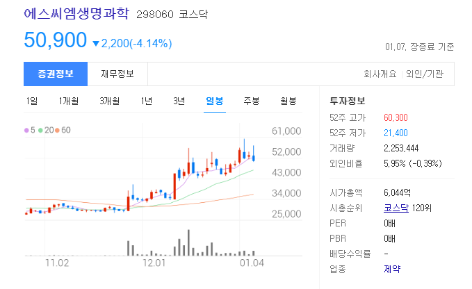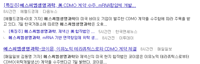 두번째는 에스씨엠생명과학입니다. 이 종목 역시 컨퍼런스 기대로 주가가 상승추세입니다. 그리고 최근에 미국 코이뮨과 CDMO 계약을 수주했다고 발표했습니다. 오늘 발표된 아주 따끈따끈한 기사입니다. 물론 장중에 발표된 기사였는데 주가에는 잠깐 반영되었다가 다시 하락했습니다. 에스씨엠생명과학은 아토피 피부염 치료제의 중간결과를 확보하여 발표 예정에 있습니다.