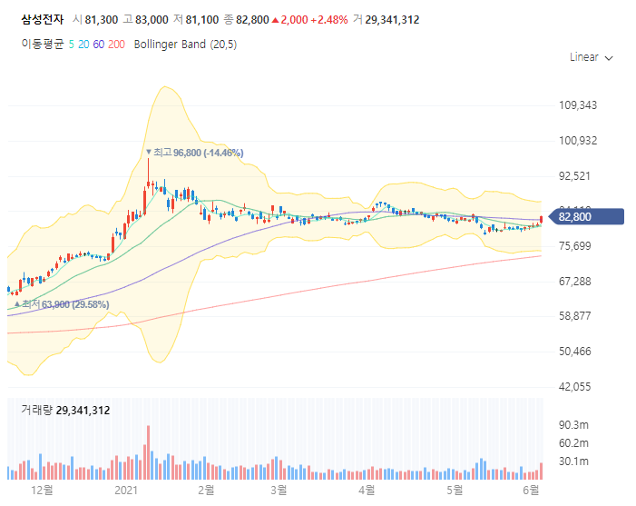 일봉으로 바꿔서 보게 되면 꽤 긴 행보를 이어가고 있습니다. 자 여기서 어느정도 생각해 볼 수 있는건 삼성전자 차트와 매우 유사한걸 볼 수 있죠. 삼성전자의 영향을 매우 크게 받는다고 볼 수 있다는 겁니다.