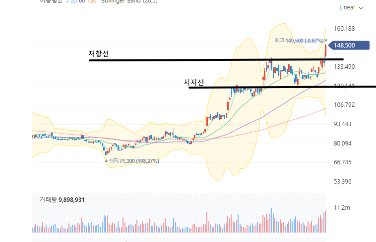 SK하이닉스의 주가는 현재 기술적 분석이 매우 어려운 역사적 최고가 자리에 위치해버렸습니다. 저항선을 아예 갭상으로 돌파해버리면서 거래량까지 터졌기 때문에, 추가적으로 충분히 상승 가능성이 있는 상황입니다.