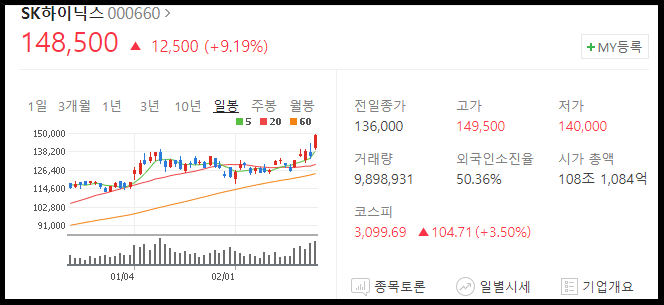 SK하이닉스는 오늘 (02/25일) 무려 9.19%가 상승하며 역사적인 최고가를 달성했습니다. 다시 한번 말씀드리지만 시총 100조짜리가 이렇게 상승한건 사실상 상한가와 다름 없습니다.