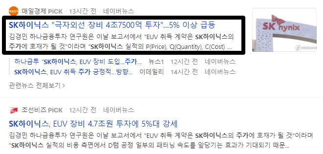 SK하이닉스의 EUV 장비 취득은 솔직히 반도체 시장에서 가질 수 있는 몇 안되는 대형호재이며, 현재 반도체 공급 부족 사태와 반도체 슈퍼사이클 사태를 등에 업은 상태에서 더욱 올라갈 수 있는 엔진을 달았다고 보면 됩니다.